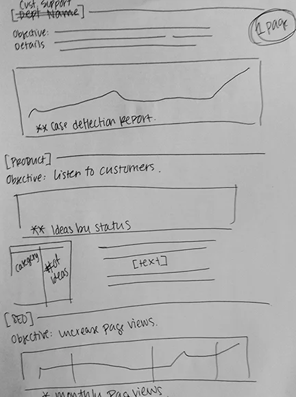 Start this process by building a basic framework of what you’re looking to achieve. And I mean literally draw/ write it out. List out ideas for reports, sketch the format of the dashboard, and write out the objectives in one sentence so they’re easier to understand. Include specific requirements from your executive team on the framework, like, “use line graphs for trends,” or “fit it all on 1 page!” A framework will help you get organized before you set to work in your reporting tool of choice, and will ensure you stay on track once you get in the weeds of reporting.